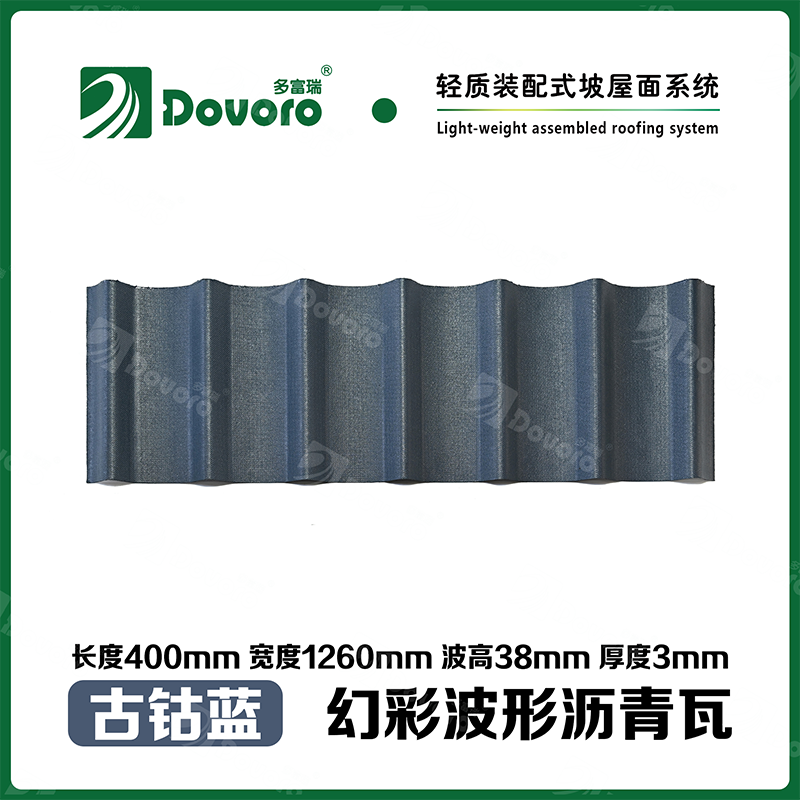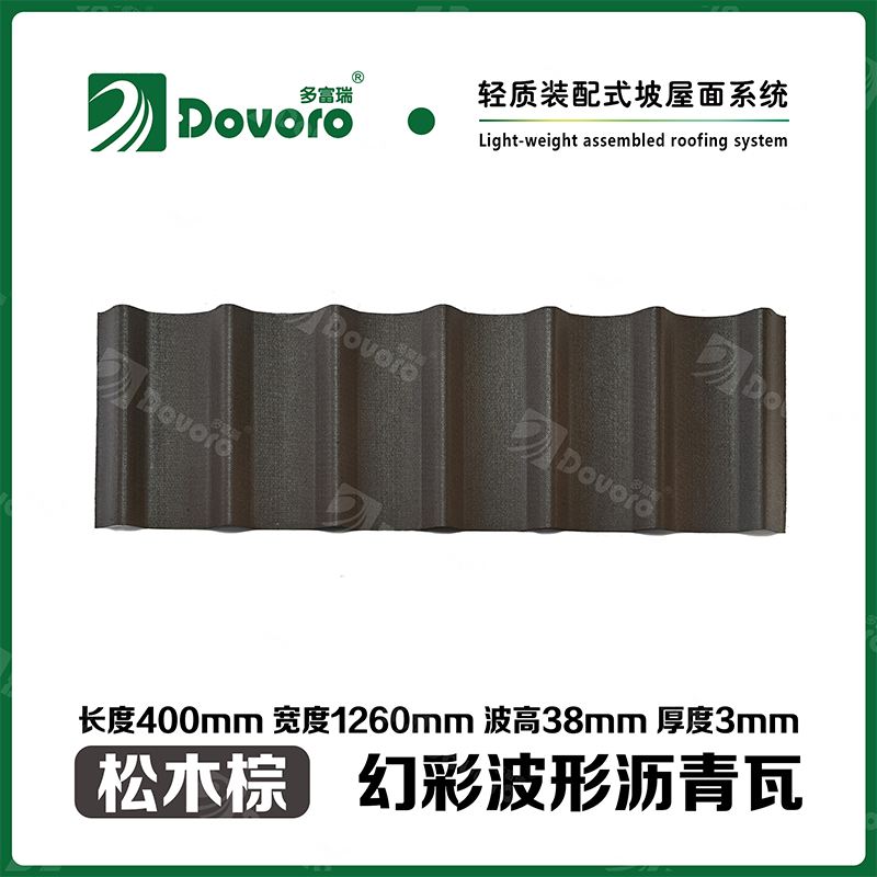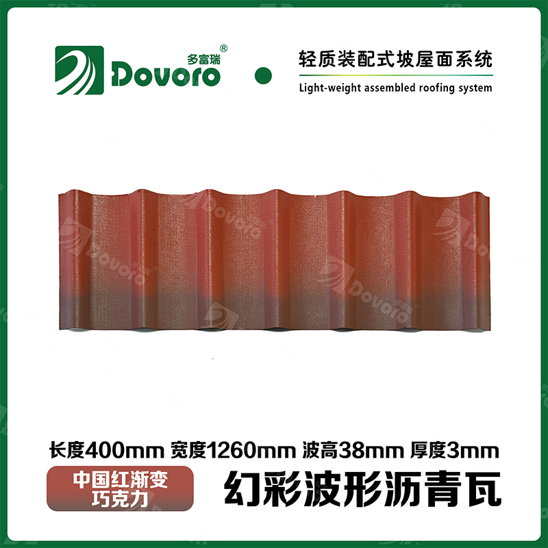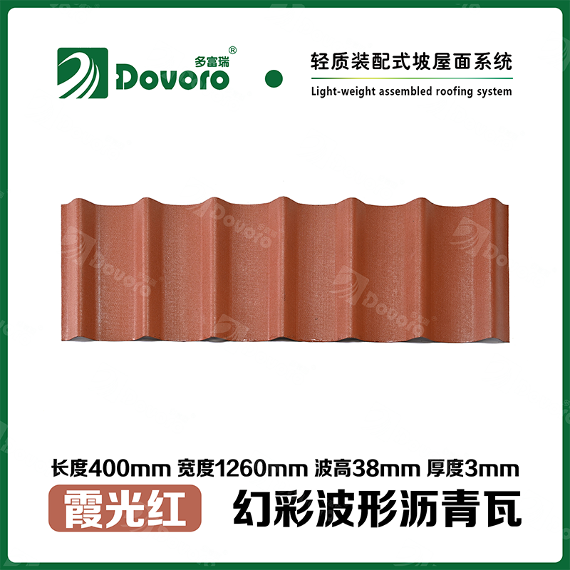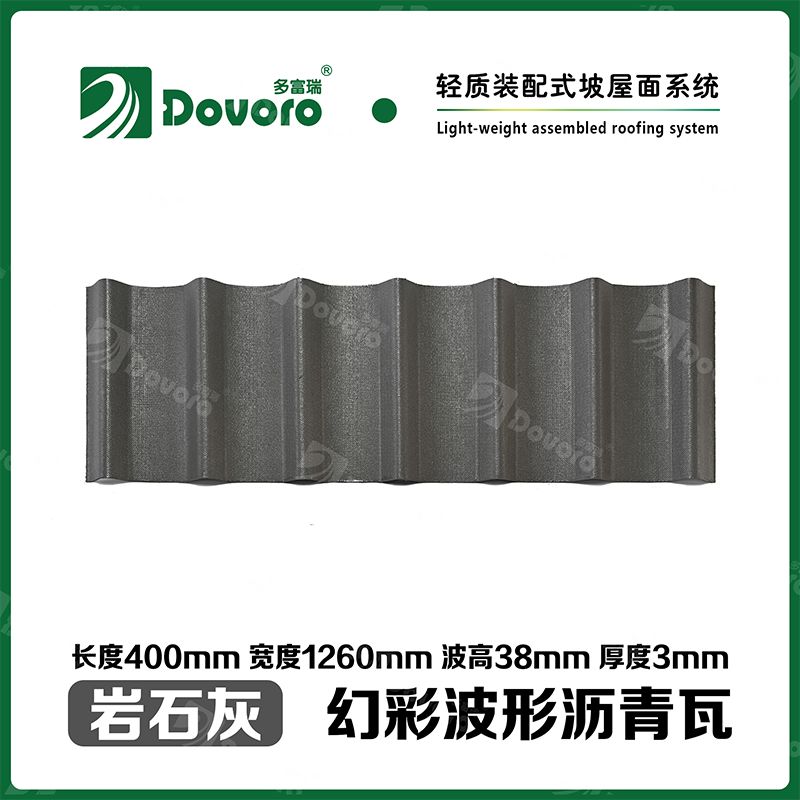 多富瑞幻彩波形瀝青瓦是由礦植物纖維板經(jīng)過整形后浸漬瀝青而成,一次成型的基層板在高溫下浸漬瀝青,使瓦材整體性更加牢固;熱固性樹脂保證了瓦材的強(qiáng)度和剛度;進(jìn)口原料配合先進(jìn)的著色工藝確保顏色持久、混色噴涂工藝使瓦材外觀高雅、色彩美觀、立體質(zhì)感。