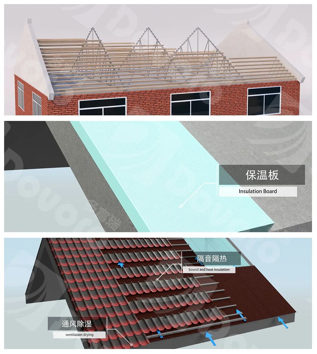 空氣是流通的,屋面的溫度就不容易傳遞到下方的空間。同時(shí)有助于降低屋面瓦的表面溫度,延長屋面使用壽命。